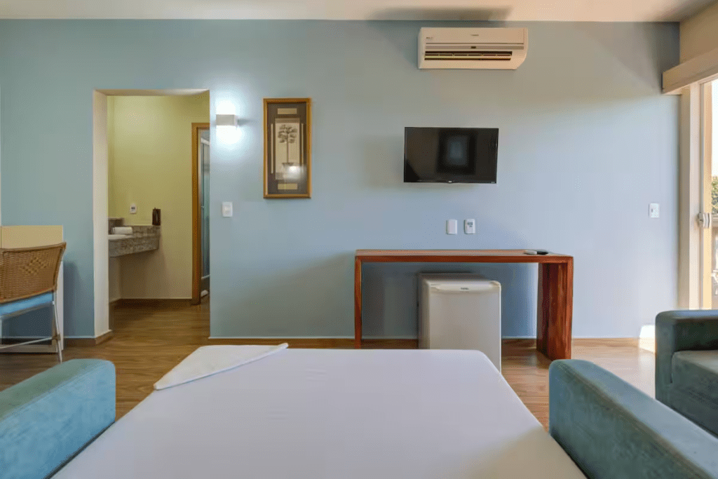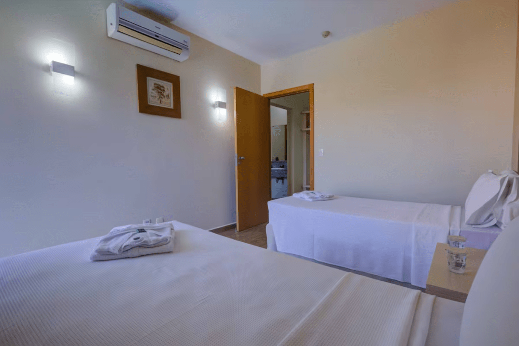 O resort oferece apartamentos confortáveis, estrutura familiar e áreas de lazer completas, com piscinas climatizadas, restaurante, bar, playground e recreação infantil.